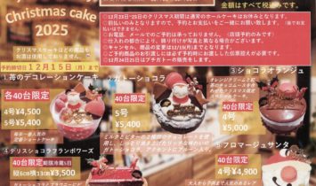 2025年クリスマスケーキご予約受付を11/1より開始いたしました。◎12月23日~25日のクリスマス期間は通常のホールケーキはお休みとなります。◎お支払いは、前払いのみとなりますので、予約とお支払いをご一緒にお願い致します。(後でお支払いはできません)◎お電話、メールでのご予約は承ってお…